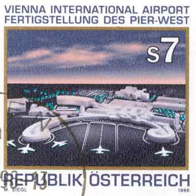 In March 1977 Aspern was finally shut down, for the airfield lay exactly below the approach path for the second, 3600 m long, Vienna-Schwechat runway. The development of Austrian Airlines and of Schwechat continue, as do the philatelic links. The first stamp below [ANK2172: 18.11.1994] shows an Air Hostess; the second one [ANK2211: 28.3.1996] the West Pier extension of the Schwechat terminal opened in 1996.