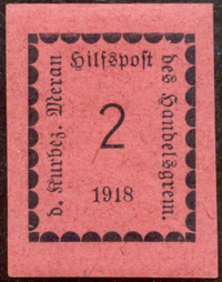 Following the occupation of South Tyrol by the Italian armies late in 1918, the postal service was suspended and the Chamber of Commerce of Meran, 35km NW of Bolzano, was authorised to establish a local post.