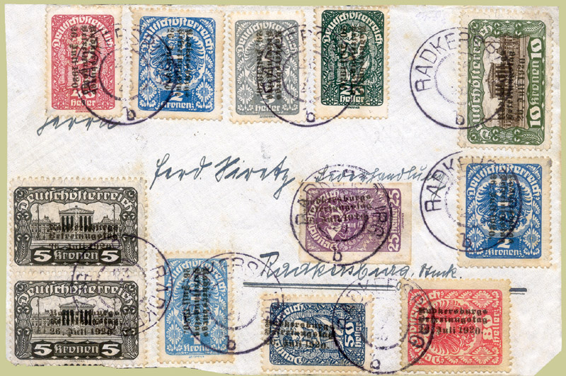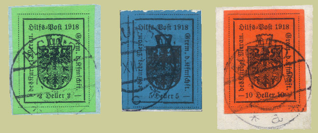 The display presented emergency and local issues most of which, although printed contrary to regulations, were actually and undoubtedly used in the mails. Some were ordered by the provincial governments (Tirol and Salzburg), others owed their existence to political or private intervention. Forgeries have been identified by Friedl and Pollak, and on the basis of their expertise the items displayed are considered to be genuine unless otherwise indicated.