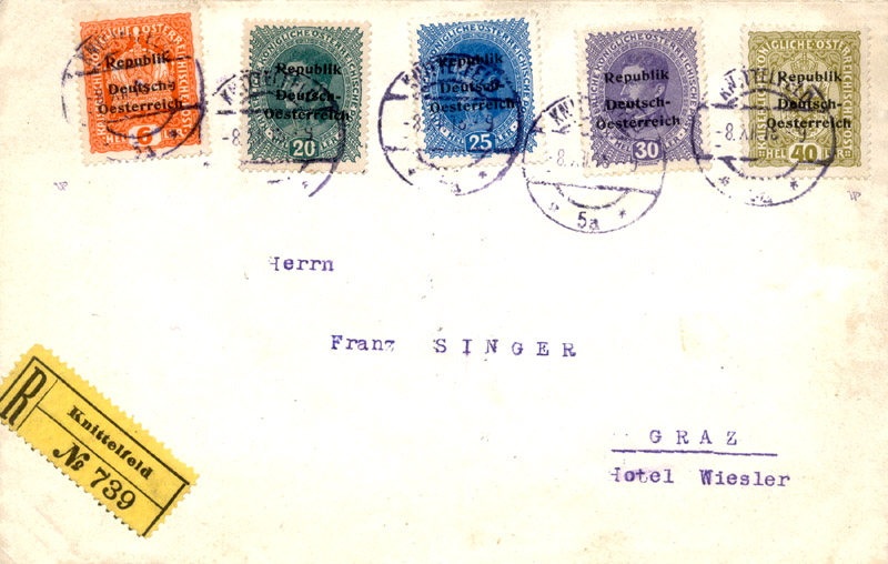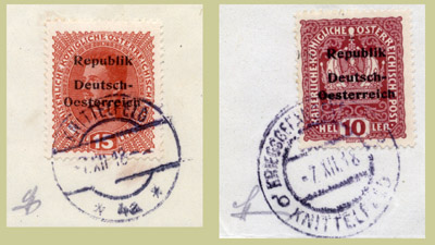 The postage stamps of the old Monarchy were still in use after the overthrow of 1918, and so the District Committee of Public Welfare of Knittelfeld in Styria decided, on the initiative of the local soldiers council, to overprint these stamps "Republik / Deutsch / Oesterreich", thus drawing attention to the new Republic. The size of the overprint was 11 x 16.5mm and this helps to identify forgeries. The overprinted stamps were issued on December 7 and 8, 1918, at the office of the Public Welfare and also by the soldiers’ District Council for the POW camp of Knittelfeld. The latter used its own Kriegsgefangenenlager / Knittelfeld cancel. The two types of cancel are shown, dated 7.XII.18. Below them is a registered letter from Knittelfeld to Graz dated 8.XII.18.