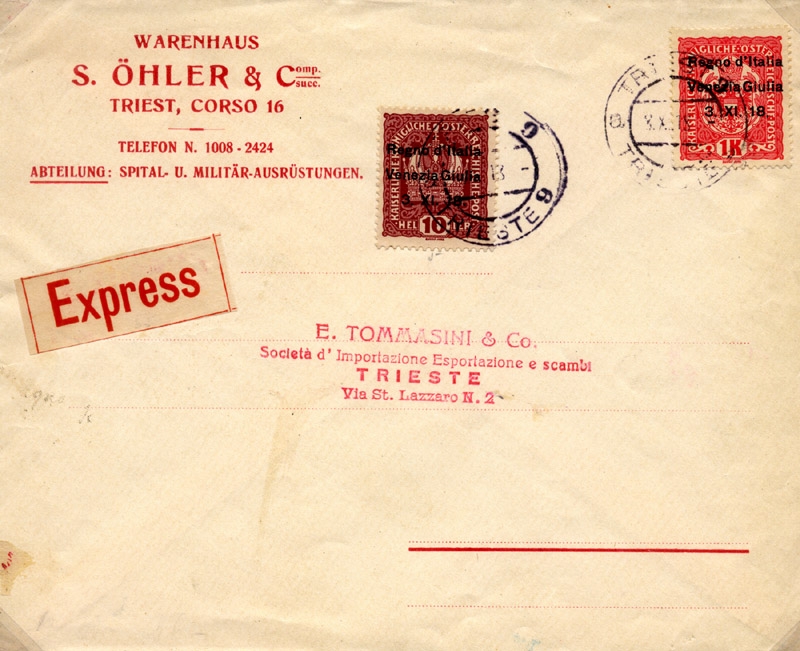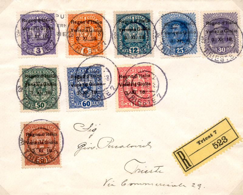 Under the terms of the Treaty of London (April 26th 1915) Italy joined the war on the side of the Allies in return for the promise of Trentino (Trento) and the Istrian peninsula, including Trieste. Italian forces entered Trento and Trieste on November 3rd 1918 and the following day the Austrians signed an armistice. The first stamp issues for the newly acquired territory were of a provisional nature. In Venezia Giulia the overprint on the then current Austrian stamps read "Regno d’Italia / Venezia Giulia / 3. XI. 18". The inclusion of Venezia Giulia into Italy was not confirmed until June 1921 at the Paris Peace Conference. Italy had included the port of Fiume in her demands but this was not acceptable to the allies