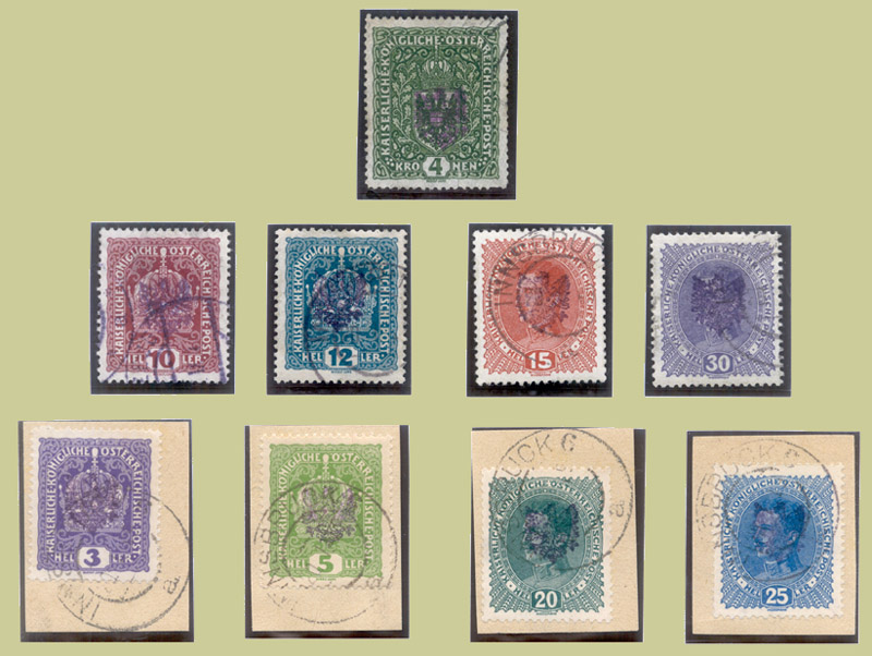 For over 300 years before 1918, the areas that were to become Czechos1ovakia, namely Slovakia and Bohemia and Moravia, had been ruled over by the Austro-Hungarian Empire. The beginnings of the new state came from an agreement between Masaryk, a Czech, and Stefanilk, a Slovak who inaugurated a movement for independence. A provisional government in exile was formed in September 1918 and Czech independence was declared in October. The Revolutionary Committee in Prague immediately authorised the overprinting of the then current postage issues of Austria as well as the printing of the first stamps of the new Republic. The overprinted stamps included the Hluboka provisionals; they were not recognised by the Central Post Authority in Prague, and their importance was probably political rather than postal.