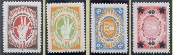 The plebiscite in the province of Carinthia was to decide whether to join Austria or Yugoslavia, and special plebiscite stamps were designed but not officially issued. lnstead the government reprinted the then current stamps in different colours and added an overprint. In spite of this, the designer of the non-accepted stamps had 1000 sets printed as essays. Although distributed, they served no postal purposes.