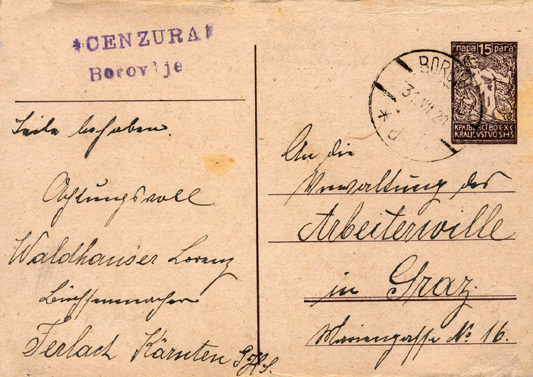 Because of the disputed border, some deemed Carinthia to be a part of the Kingdom of Serbs, Croats and Slovenes (SHS). The card above carries the 'SHS' postmark and censor of "Borovije" (Yugoslavian name for the Austrian town of Ferlach, just 16km south of Klagenfurt) with the senders address clearly stating "Ferlach Kärnten / SHS". The card was sent 31.VII.20 in the run-up to the plebiscite.