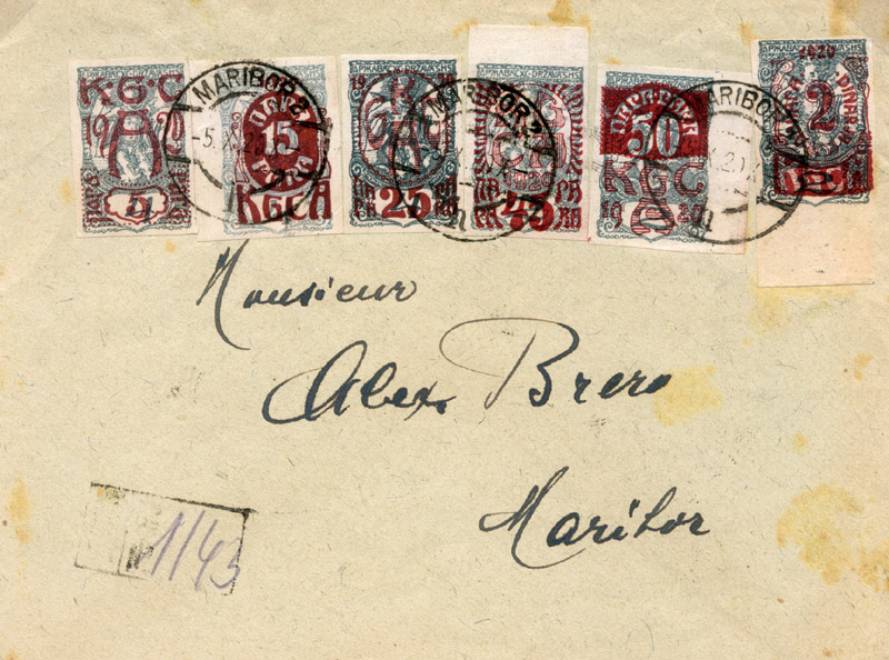 The cancellation of current postage stamps with the small circular hand-stamp was not authorised and after August 8th 1920 the overprinted stamps were invalid. On October 12th 1920, the Ministry of Communications declared that the overprint was done without the approval of the postal authorities, and it therefore had no official standing. The official postal cancellation for the regular mail was the Yugoslav "SPILJE" obliterator, seen on the cover below sent to Wien, dated 10.VIII.20.