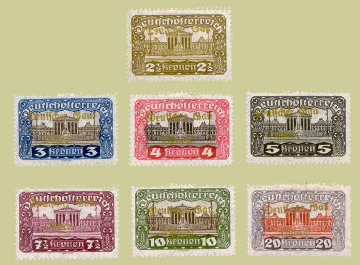 In Lienz the Plebiscite Committee for the Eastern Tirol ordered an overprinting of Renner Republic stamps with the words "Deutscher Gau Osttirol", and on October 16th 1920, these stamps were sold or distributed on the occasion of the proclamation of the German Gau (district) Osttirol in Lienz. These stamps were no more than private propaganda essays. Despite a selling price of 500 Kronen (face value 121.20 Kronen) they were quickly bought up. They were overprinted in gold; such was the demand for the first issue that a reprint in dull gold, consisting of 1000 sets, was supplied. Mail bearing first issue and reprint stamps was treated as unfranked.