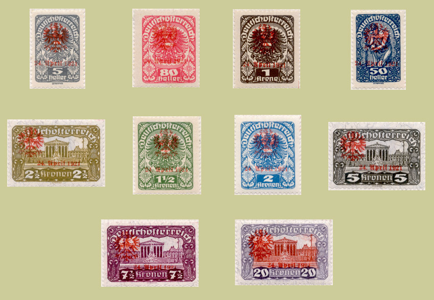 On April 24, 1921, a plebiscite was held in the Tirol to decide on a possible link up with Germany. Ihe plebiscite committee, with the consent of the Tirolean government, instructed the Innsbrück printing works to overprint the then current postage stamps with a lithographed eagle and date. Ten values were selected, the number of each overprinted ranging from only 500 to 3,800 according to value. There were two issues. In the first, Type 1, the eagle’s tail is blunt and on the high values there is no hyphen between 'April' and '1921'. In Type II the eagle has a tail feather and there is a hyphen on the high values between 'April' and '1921'.