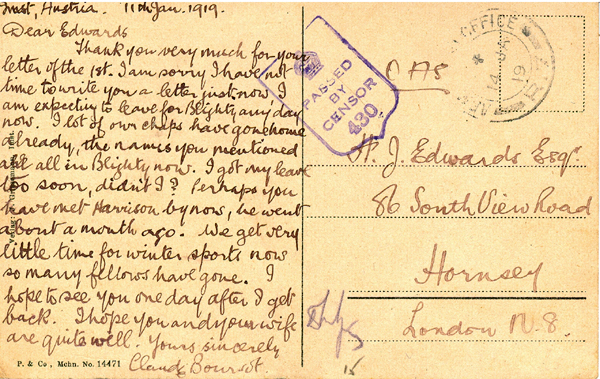 ARMY POST OFFICE / R.7 / 14 Jan 1919 To H.J.Edwards Esq / 86 South View Road / Hornsey / London N8. Imst, Austria 11th Jan 1919 / Dear Edwards / Thank you very much for your letter of the 1st. I am sorry I have not time to write you a letter just now, I am expecting to leave for Blighty any day now. A lot of our chaps have gone home already, the names you mentioned are all in Blighty now. I got my leave too soon, didn't I? Perhaps you have met Harrison by now, he went about a month ago. We get very little time for winter sports now so many fellows have gone. I hope to see you one day after I get back. I hope you and your wife are quite well. Yours sincerely Claude Boursot (?) [Post office R.7 is believed to have been in north Italy] |