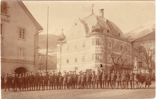 This is a photograph of British troops in Imst. It wasn’t posted, but brought back. On the back is written "Taken 1919 / Mch 1921 / To dear Edith / With all my / love from / Bert / a souvenir of / Austria". The inked X presumably identifies Bert. Careful scrutiny of the cap badges on the original reveals both HAC-type and Manchester-types. The photo must thus have been taken in February 1919, when both regiments were in Imst.