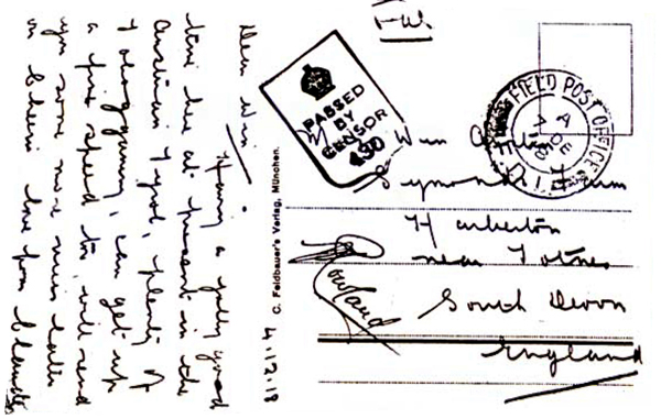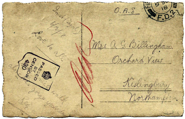 The HAC’s censorship cancel was a violet frame containing a crown and PASSED BY CENSOR / 430. All cards bar the first have "O.A.S." handwritten at the top; this will be "On Active Service" to justify the absence of franking. For each, the date of the canceller is at the top; the (earlier) date of writing below.