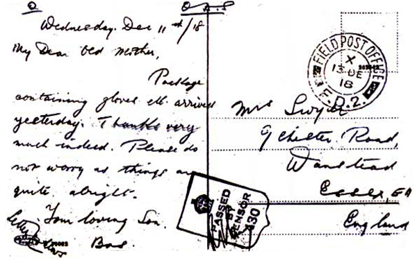 FIELD POST OFFICE / F.D.2. / 13 Dec 1918 To Mrs Smyth, Essex Dec 11th/18. My dear old mother, package containing gloves etc arrived yesterday. Thanks very much indeed. Please do not worry as things are quite alright. Your loving son Bas. |