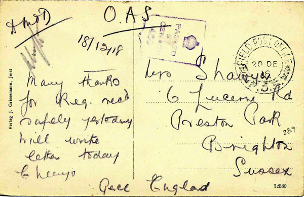 FIELD POST OFFICE / F.D.3. / 20 Dec 1918 To Mrs Shaury, Brighton. 18/12/18 Many thanks for Reg rec’d safely yesterday. Will write letter today Cheerio |