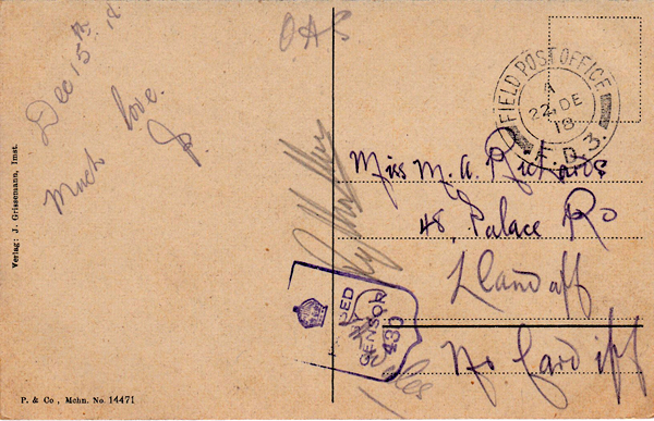 FIELD POST OFFICE / F.D.3. / 22 Dec 1918 To Miss M A Richards, Llandaff, Wales Dec 15th 18 Much love [Initalled not signed, but it’s from Percy Gribble. See later.] |