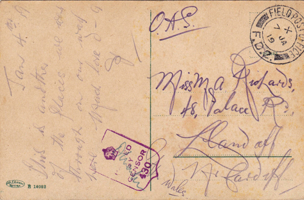 FIELD POST OFFICE / F.D.2. / 7 Jan 1919 To Miss M A Richards, Llandaff, Wales Jan 4th 19 This is another of the places we went through on our way here. Much love darling. Percy Gribble. |