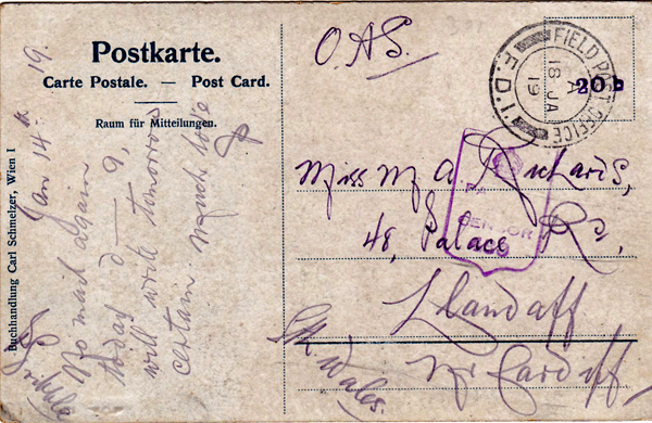 FIELD POST OFFICE / F.D.1. / 18 Jan 1919 To Miss M A Richards, Llandaff, Wales. Jan 14th 19. No mail again today darling, will write tomorrow certain. Much love. Percy Gribble |