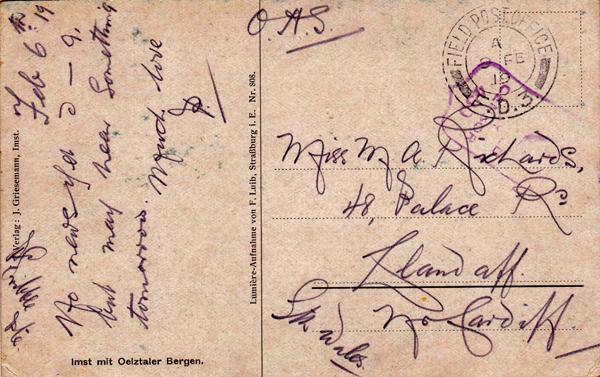 FIELD POST OFFICE / F.D.1. / 9 Feb 1919 To Miss M A Richards, Llandaff, Wales. Feb 6th 19. No news of you darling, but may hear something tomorrow. Much love. [Scribbled signature in L margin, possibly "Gribble Pte" ie Private.] |