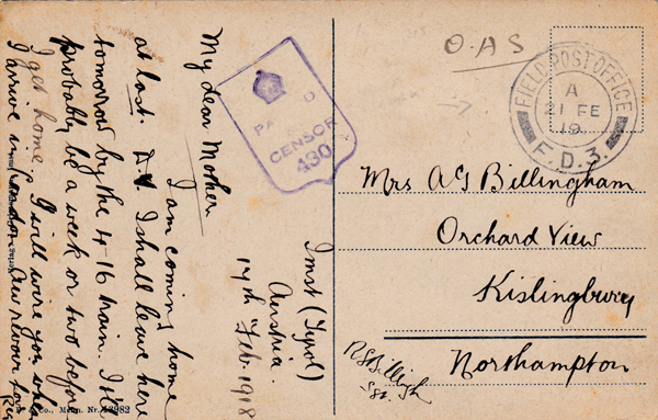 FIELD POST OFFICE / F.D.1. / 21 Feb 1919 To Mrs A G Billingham, Northampton Imst (Tyrol), Austria, 17th Feb 1918 [this must be a mistake for 1919!] My dear mother, I am coming home at last. D.V. I shall leave here tomorrow by the 4‑16 train. It'll probably be a week or two before I get home. I will wire you when I arrive in London. Au revoir. Love Reg. [Address side signed R.S.Billingham Sgt]. |
