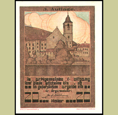 As Austria extracted itself from the wreckage of the Empire, one of the many problems was the shortage of small change. A Decree was therefore issued by the Finance Ministry, effective from either 21 or 26 November 1918, authorising official bodies to issue "Geldersatzzeichen" or Notgeld. These were to be valid for not more than three months, and backed up by a corresponding deposit in a branch of the Austria-Hungarian Bank or a postal savings office..