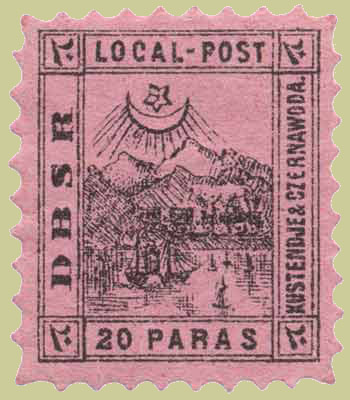 In 1860, a British-owned railway link was built along the route. Special stamps were issued by the railway for mail it carried. The originals were lithographed in blue-green, and inscribed D.B.S.R. (Danube and Black Sea Railway). Later, reprints were made on various coloured papers (the illustrated specimen is on pale lilac).