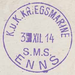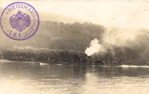 On 29th July 1914, the First World War began with the firing of a salvo from monitors of the Austrian Danube Flotilla directed at Belgrade. For the remainder of the war, vessels of the flotilla remained active patrolling the river, clearing mines and other obstructions and supporting the army commanders in military operations. Items of mail from these ships generally received F.P.O. cancellations although a few ships (eg the Enns, a twin-turret monitor, shown below) had their own dated postmarks. Mail from shore bases usually received the local town cancellation.