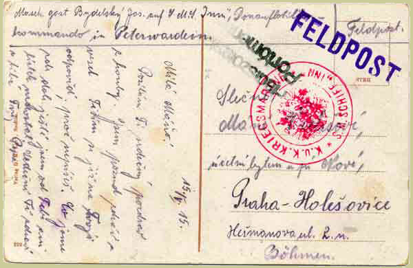 This Feldpost card was sent from S.M.S. Inn, another twin-turret monitor, to Bohemia, on 15 April 1915 when she was based at Petrovaradin. The 2-line Hungarian endorsement indicates free postage for the armed services.