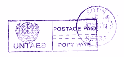 This postage paid mark was applied by UNTAES, the United Nations Transitional Administration in Eastern Slavonia, which functioned from 10 May 1996 to 15 January 1998. The cover was sent from Sotin to Slunj, ie from a Serb-held area to Croatia, and in order to avoid the use of Serb-inspired postage stamps (which were unacceptable) was sent via UNTAES.