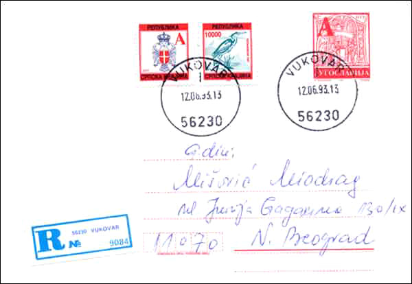 In the autumn of 1991, Vukovar was virtually destroyed by Yugoslav National Forces and Cetniks as they advanced into eastern Croatia. This registered letter of 12 June 1993 is prestamped Yugoslav stationery issued in 1993, with added adhesives of the Serb Republic of Krajina.