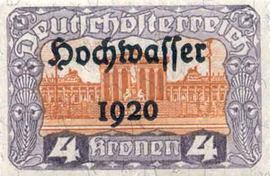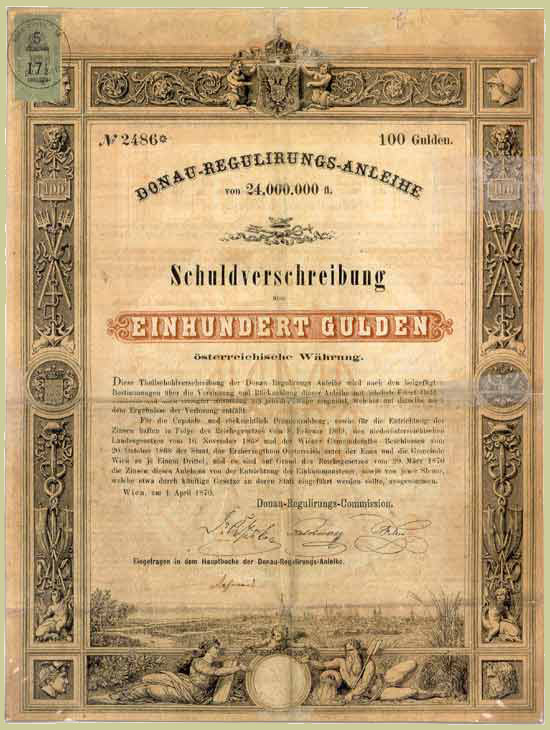 For many years, severe flooding by the Danube gave rise to increasing loss of life and heavy damage to property adjacent to the river as industrialisation developed. To meet the cost of counter-measures, funds were raised through the issue of bonds, usually in the form of an attractively designed document. Between 1870 and 1877, 32 million florins (or gulden; equivalent to £3M sterling in 1870s money - perhaps £500M today?) was raised in that way. The illustration is of a Loan Note for 100 Gulden, with at the top left a revenue stamp for "5 GROSCHEN ODER 17½ KREUZER" cancelled at Breslau, then in Germany and now in Poland.
