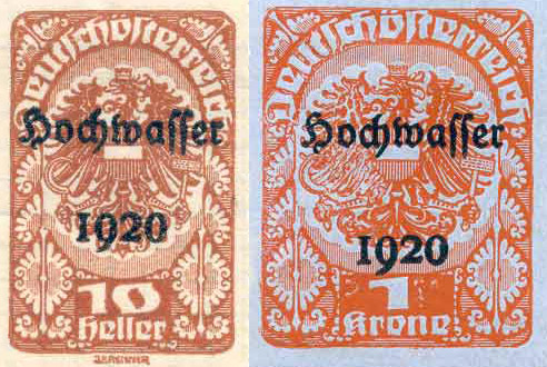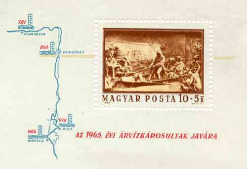 Six countries have issued special stamps to raise funds for Danube flood relief. Hungary led the way in 1913 with a set of 17 stamps (1900 definitives, with a special label attached), Austria in 1921 (20 definitives in new colours, with overprints), Yugoslavia in 1926 (12 definitives, surcharged) and Bulgaria in 1939 (4 definitives, surcharged). Thereafter specially designed stamps were issued by Hungary (1940, 1965, 1997), Czechoslovakia (1965) and Rumania (1970).