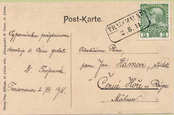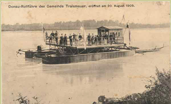 The postcard was sent from Traismauer, a small village on the Traisen (a tributary of the Danube) 60km west of Vienna. A chain ferry across the Danube was opened on 29 August 1905.