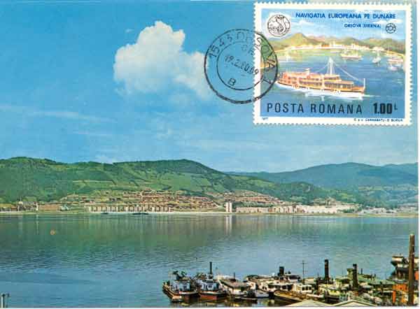 This card shows the new town of Orsova. The Rumanian stamp celebrates the Danube as a European navigational resource.