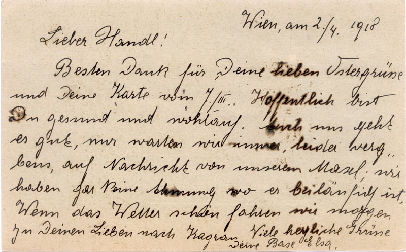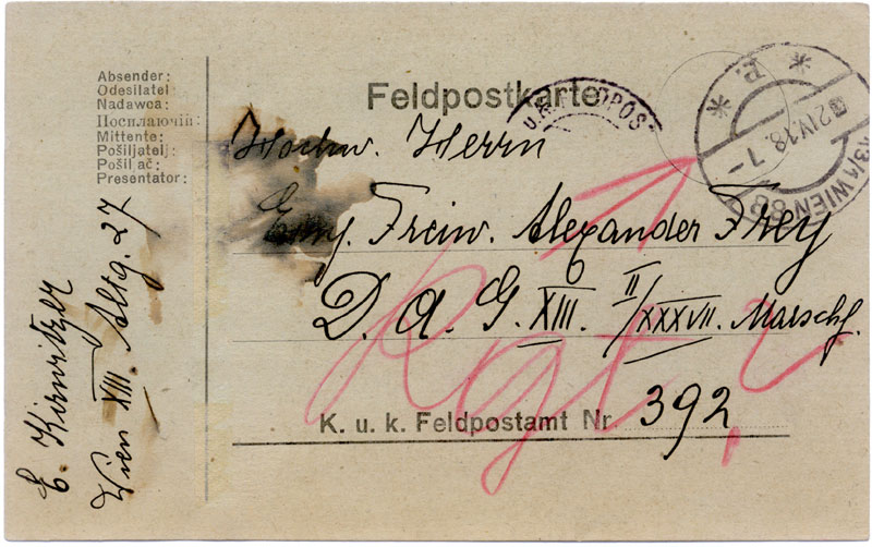 The card is addressed to a volunteer soldier: Hochw. Herrn Einj. Freiw. Alexander Frey, at some sort of unit at field post office 392. Herr Frey’s ‘rank’ is Einj. Freiw., that is Einjahr Freiwilliger (One year volunteer.) Men with a certain level of education were permitted to volunteer for one year's service to fulfil their military obligation. Soon after the Austro-Hungarian authorities realised that the war would not be a short affair, the terms of enlistment for a volunteer were changed to "the duration of the conflict".