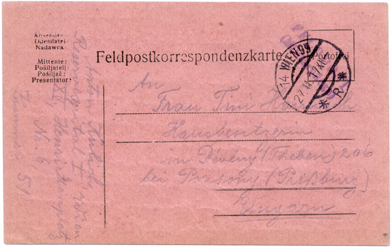 Two Feldpost cards were discovered in an accumulation, with cancels that "looked pneumatic"; so it was asked "why?" and as a supplementary "and how during WWI did mail get from Vienna to and from the Front?". Both cards were sent from Vienna; a grey to the field and a deep red to a domestic address in Hungary. Both are in good condition and show no signs of the characteristic folding of mail carried by the pneumatic post.