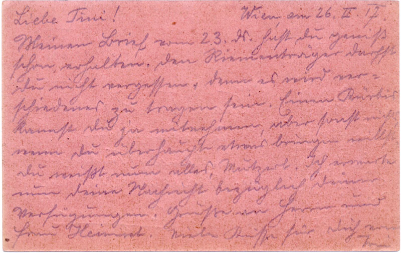 This deep red card was written on 26 Feb 1917 by Anton Kublik who is in Room 51 in Reservspital I, Henriettenplatz 6, Wien XV (so he’d be entitled to use Fieldpost) to a lady in Theben bei Posony, Hungary. The cancel is 14 WIEN 99 / 27.II.17XI- / * R * with a dash where the minutes could go. It is of a pneumatic type; but Wien 99 was never pneumatic: nor was this card. According to Schanzer, some R cancels were for Reklam (ie slogan cancels); there isn’t one for Wien 99 listed in Stohl as far as we can see. Schatz-by-Görig has a 14 Wien 99 R; but made in 1926 (maybe as a replacement). So, this cancel could have existed (ie it isn’t faked); and it exists used (here!); but the card had no reason to use the pneumatic system; and there is no evidence that it did.