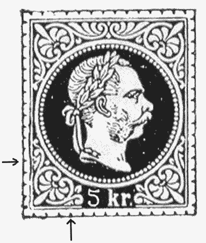 Gary Ryan has pointed out that illustrations of the 'coarse' and 'fine' prints (such as that given in Michel or Gibbons) are an oversimplification and considerable experience is sometimes required to differentiate between the two. Study of the paper or the perforations can assist. However, a more reliable guide for the 5kr value is available, by examination of detailed design variations: see below. The first type II appeared in 1872, hence no type II stamps were sold in Hungary.