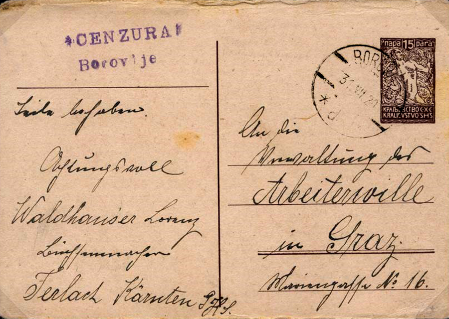 Because of the disputed border, some deemed Carinthia to be a part of the Kingdom of Serbs, Croats and Slovenes (SHS). The card above carries the 'SHS' postmark and censor of "Borovije" (Yugoslavian name for the Austrian town of Ferlach, just 16km south of Klagenfurt) with the senders address clearly stating "Ferlach Kärnten / SHS". The card was sent on 31.VII.20 in the run-up to the plebiscite.