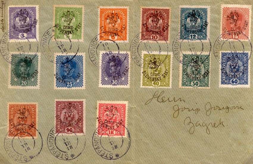 For over 300 years before 1918, the areas that were to become Czechos1ovakia, namely Slovakia and Bohemia and Moravia, had been ruled over by the Austro-Hungarian Empire. The beginnings of the new state came from an agreement between Masaryk, a Czech, and Stefanilk, a Slovak who inaugurated a movement for independence. A provisional government in exile was formed in September 1918 and Czech independence was declared in October. The Revolutionary Committee in Prague immediately authorised the overprinting of the then current postage issues of Austria as well as the printing of the first stamps of the new Republic. The overprinted stamps included the Hluboka provisionals; they were not recognised by the Central Post Authority in Prague, and their importance was probably political rather than postal.
