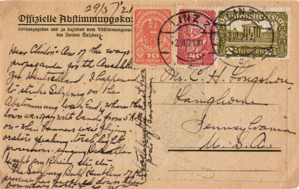 Official postcard with message written in Salzburg on 29/5/21 regarding the events of the day, but posted in Linz on 2.VI.21 to the USA. It says Dear Clinton, One of the ways of propaganda for the Union with Germany. I happened to strike Salzburg on the Abstimmung weekend, where the town was gay with bands from 5 a.m. on, where banners were flying, orators speaking, torch light processions, singing "Die Wacht am Rhein" etc. etc. The Salzburg Bull the emblem of the province has battered down the boundary posts and is now proclaiming the last frontier for former parts of Bavaria.