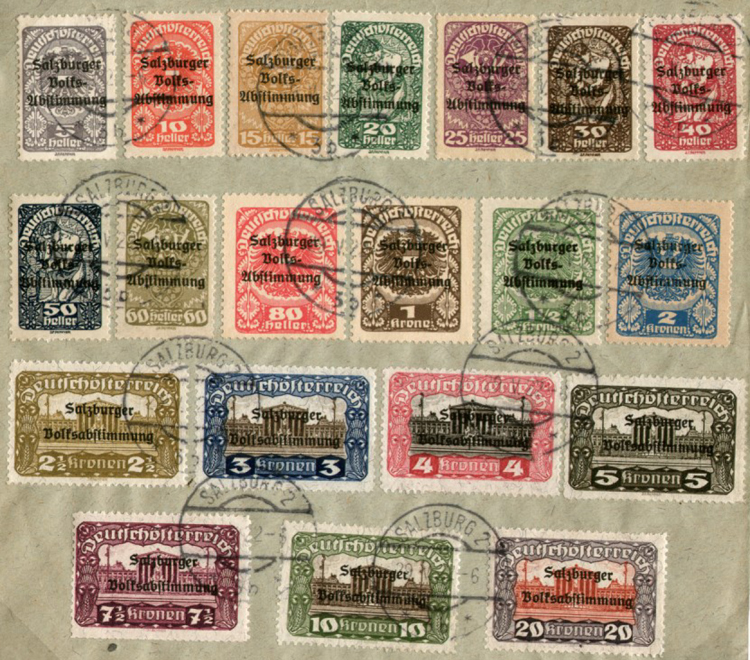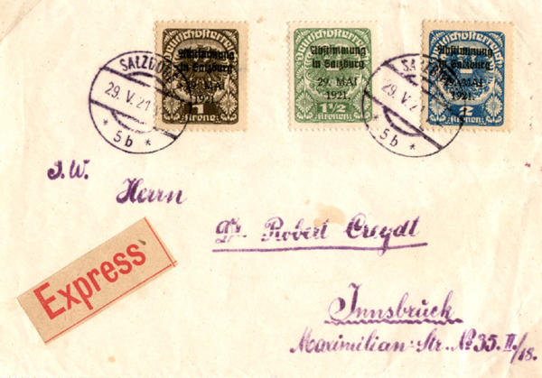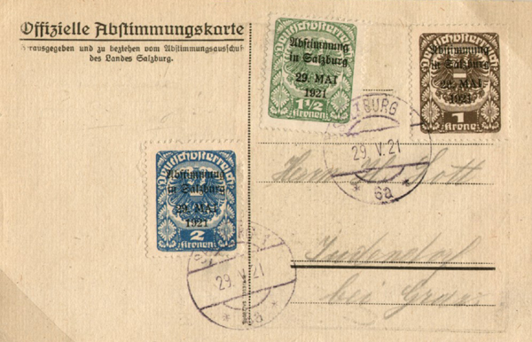 Three stamps overprinted for the Plebiscite on May 29 1921 with a four-line typo overprint hand-set in Innsbruck. Both the white-paper and the grey-paper printings were overprinted. These stamps were sold in Innsbruck and Salzburg at face value plus a donation. Used here on the official postcard picturing a bull, the Salzburg symbol, of which 5,000 were printed.