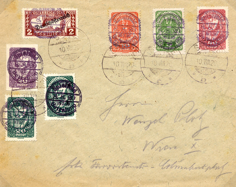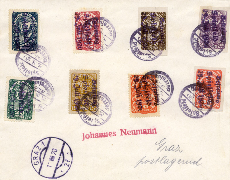 Letter to Graz dated 8.8.20, with overprint showing the variety ‘missing s’.