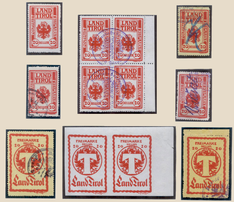 To control parcels containing goods destined for foreign countries, the export of which was forbidden, the Tyrolean Government ordered on April 17th 1919 their control in both postal and rail transportation. Originally it was intended to use small stamps for postal parcels and large stamps for railway parcels but this arrangement was short-lived.