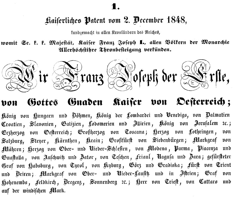 Above is the start of the Imperial Patent in which Franz Josef announces to his subjects that he is now their ruler.