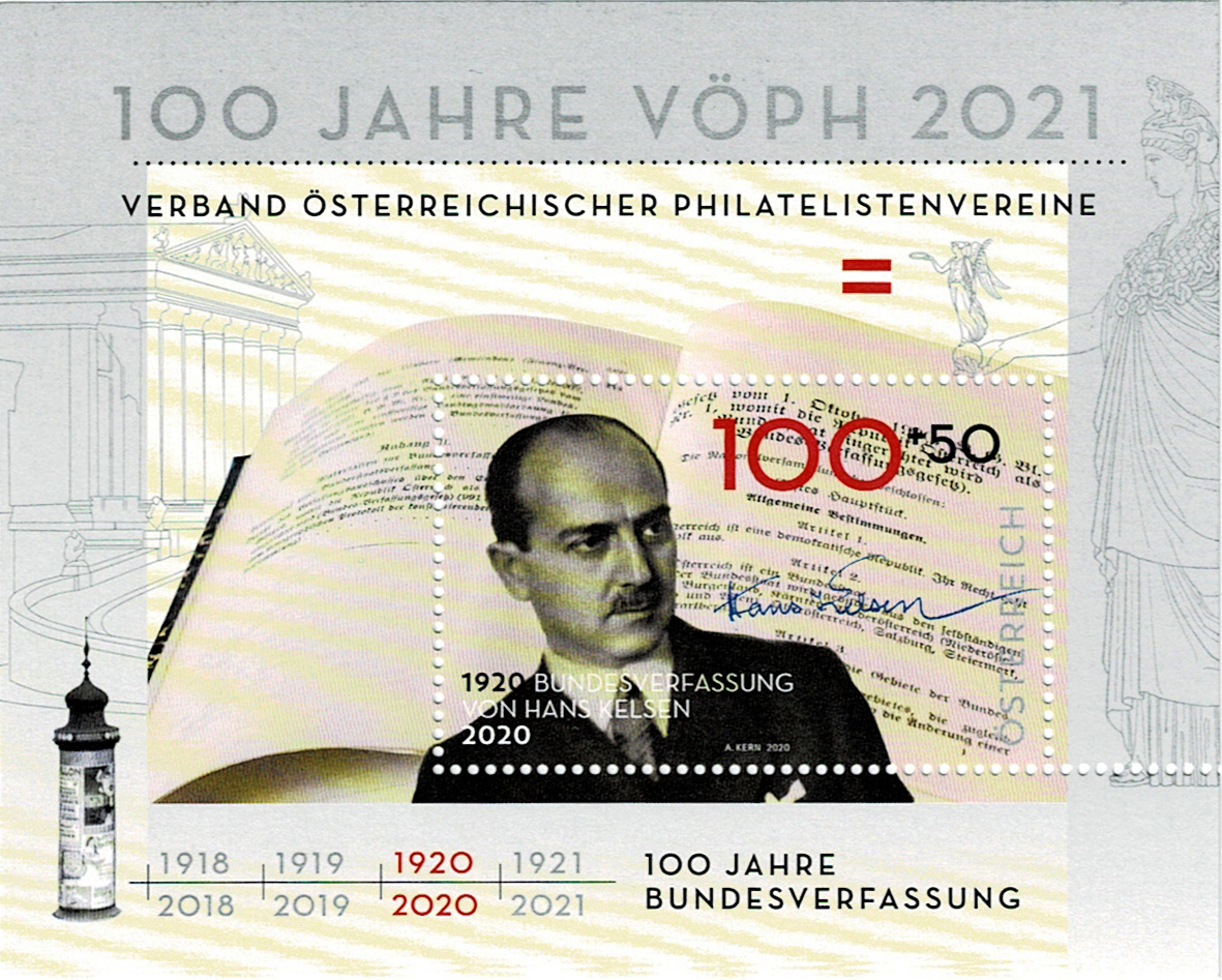 As part of a series for the 100th anniversary of the VÖPh, the 2020 stamp was dedicated to the Austrian Federal Constitutional Act (Bundesverfassungsgesetz), passed in 1920. The special stamp block (the surcharge of 0.50 euro was for the 100th anniversary of the Österreichischer Philatelistenvereine (VÖPh)) shows the first articles of the Federal Constitution behind a portrait of Hans Kelsen. The parliament building in Vienna, in which the Federal Constitutional Law was passed in 1920, as well as the statue in front of Pallas Athena with the goddess of victory Nike standing in her hand, form the distant background.