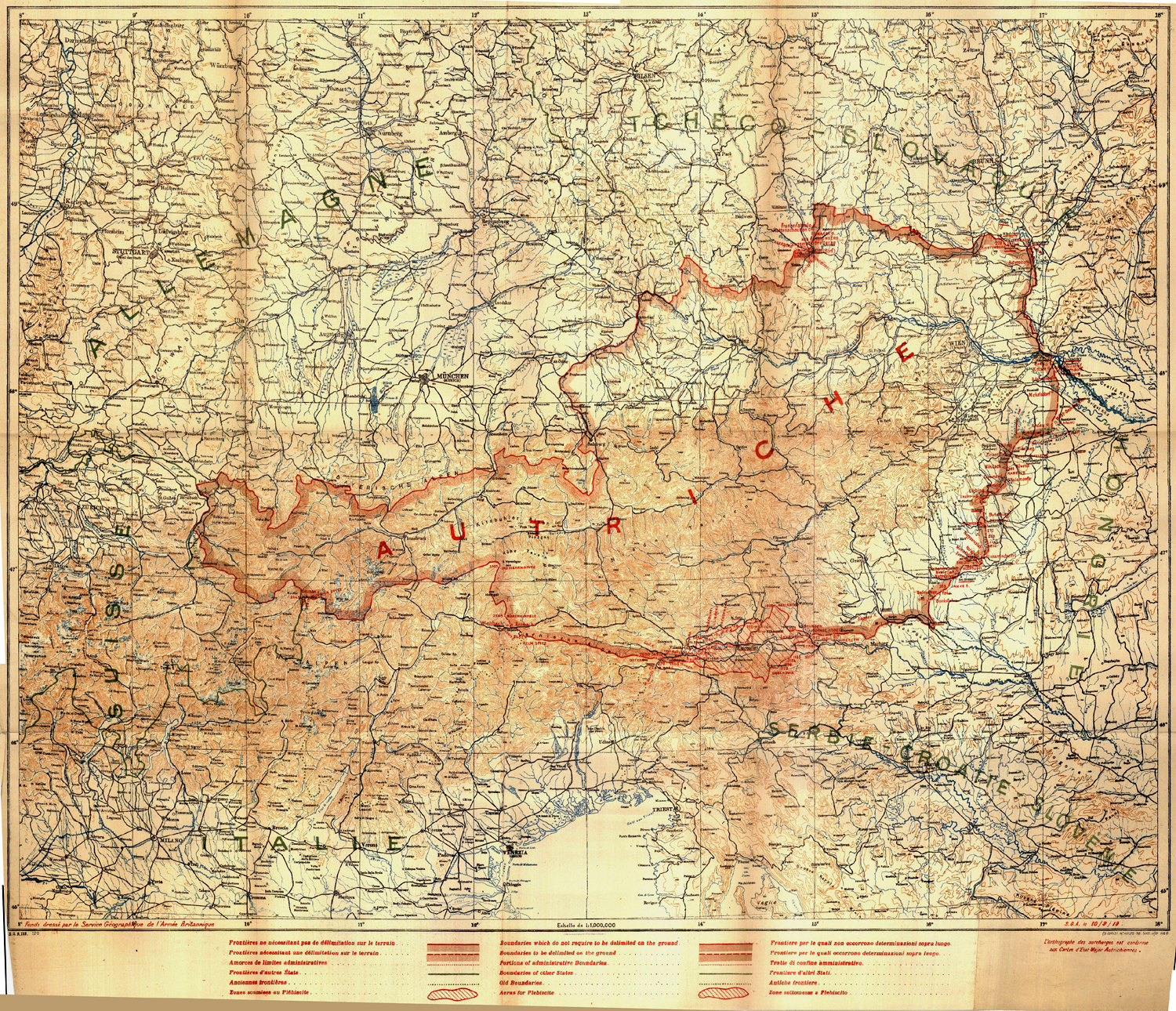 The Treaty of St Germain, which ended WWI as far as Austria was concerned, is available on line in several different language versions. A parallel-text French and German version is in the Austrian Staatsgesetzblatt for 1920, pp 995-1245, beginning here. Note that it's images of pages, not text. The navigation arrows are in the top right corner. The Australian Treaties database has a plain-text version here. You lose the layout but it's searchable, and a much smaller file. A plain-text version (origin unclear; 137 pages long!) exists as a PDF file, here. A much-reduced version of the accompanying map is below.