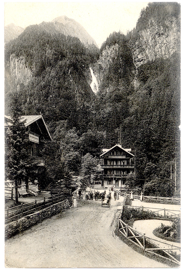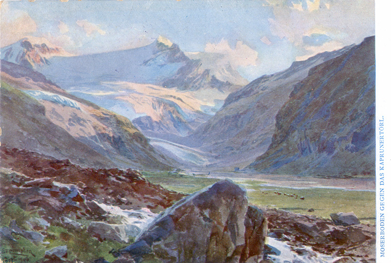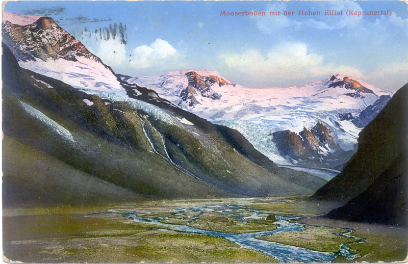 Kaprunerthal is located in Salzburgerland, in the Pinzgau. It’s a typical glacial side valley, running south from Zell am Zee towards the Gross Glockner. The town of Kaprun lies at the northern end. The valley has majestic Alpine scenery; in summer it is full of walkers & climbers; marmots can be seen. In winter, skiers take over. These cards shows the upper valley before the dams were built.