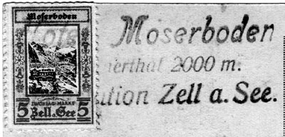 Postcards sold at the hotel also received a 3-line boxed Hotel Cachet in violet or black: HOTEL MOSERBODEN / 2000 Meter / Kaprunerthal but one could bring ones own card and post it, receiving only the Postablage mark. The two cachets are not always in the same colour, further showing that they were applied separately. Oddly, before the Postablage opened the hotel cachet was oval and the hotel's height only 1968 meter - indeed a 1900 example has 1968m on the picture side and 2000m on the cachet. Yes, the Alps are rising, but not that fast!