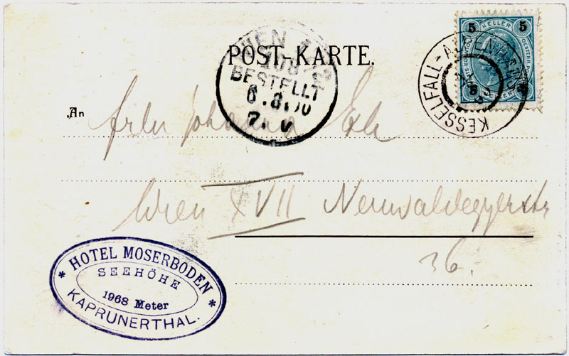 This card shows the ring cancel; the date is unreadable. Note the curious scuffing on the adhesive, which seems to be a printing flaw as the paper surface is intact. The hotel has risen to 2000m, and the cachet is so faint that the sender has rewritten the Kaprunerthal in pencil! The Postablagen cancel is black.