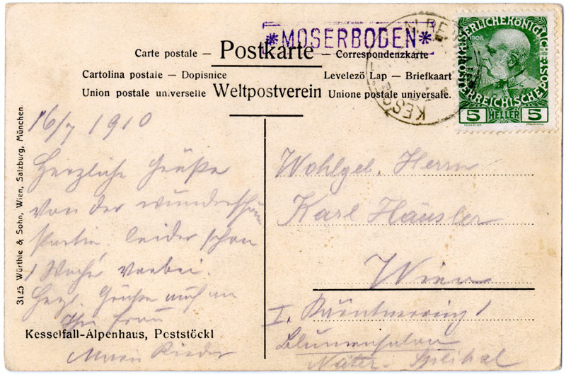 This card shows the double circle KESSELFALL-ALPENHAUS cancel in a very worn state; the card is dated 16 July 1910. The picture on the card is of the Alpenhaus, and the absence of a Moserboden hotel cachet shows that it was carried up by its writer and posted there.