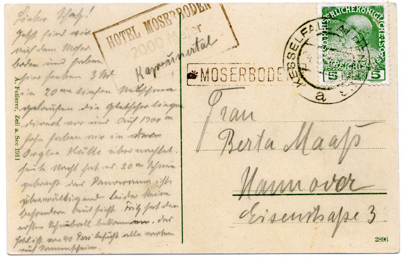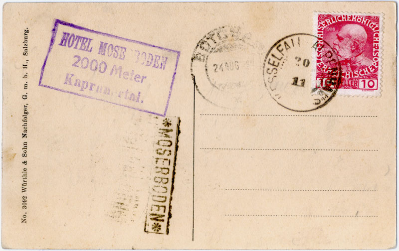These two hotels were opened towards the end of the 19th century, and at first were served by an Austrian government post office in the Alpenhaus and a Postablage at Moserboden. Moserboden used the standard boxed * MOSERBODEN * Postablage mark from 21 July 1904. It is recorded from 1904 to 1914 in black and violet, and the office was supposedly open from 15 June to 15 Sept each year. It seems to have been closed during WWI, reopening in 1920 for a couple of years. Mail from it was carried by the postperson to Kesselfall Alpenhaus (where there was a summer Post Office) for franking.