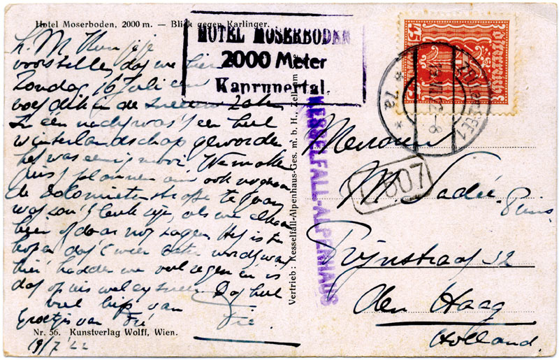 45 kr adhesive cancelled on 19 July 1922 at ZELL am SEE 1. Moserboden Hotel cachet; the KESSELFALL-ALPENHAUS may be Kuhnel’s third postablage cancel but it does look very like a hut cachet. Note the Dutch delivery-round mark. The Kesselfall-Alpenhaus post office must have been shut.